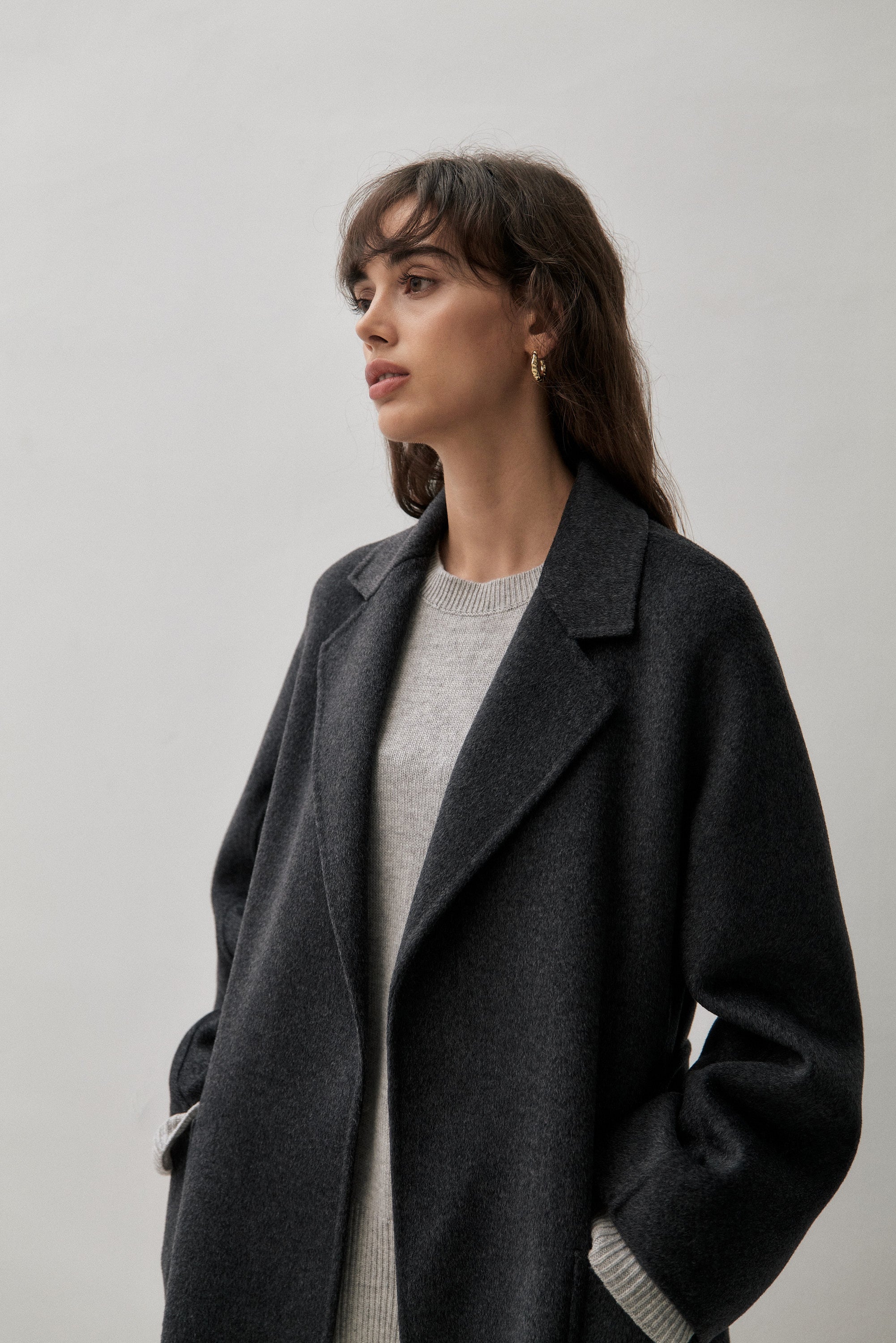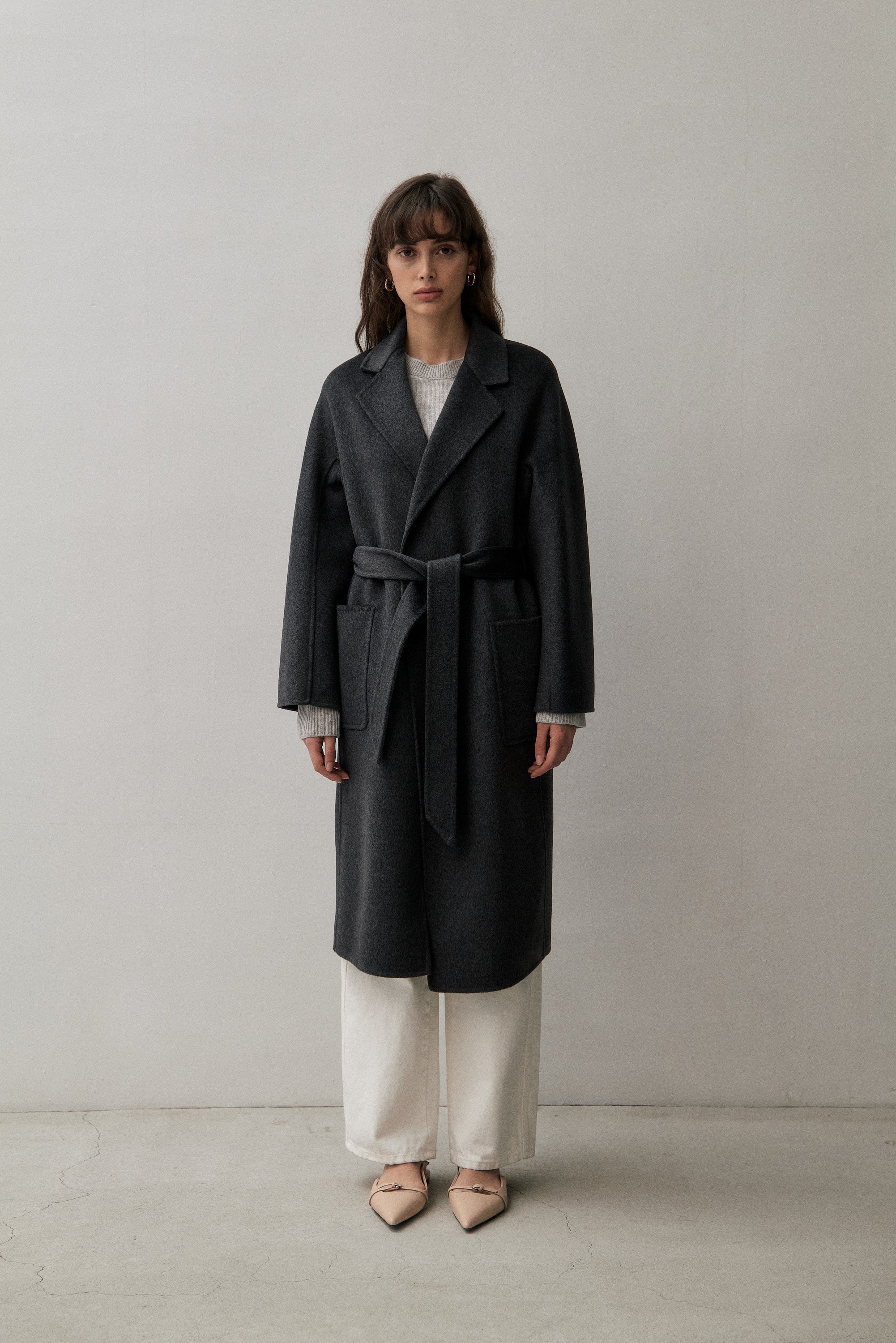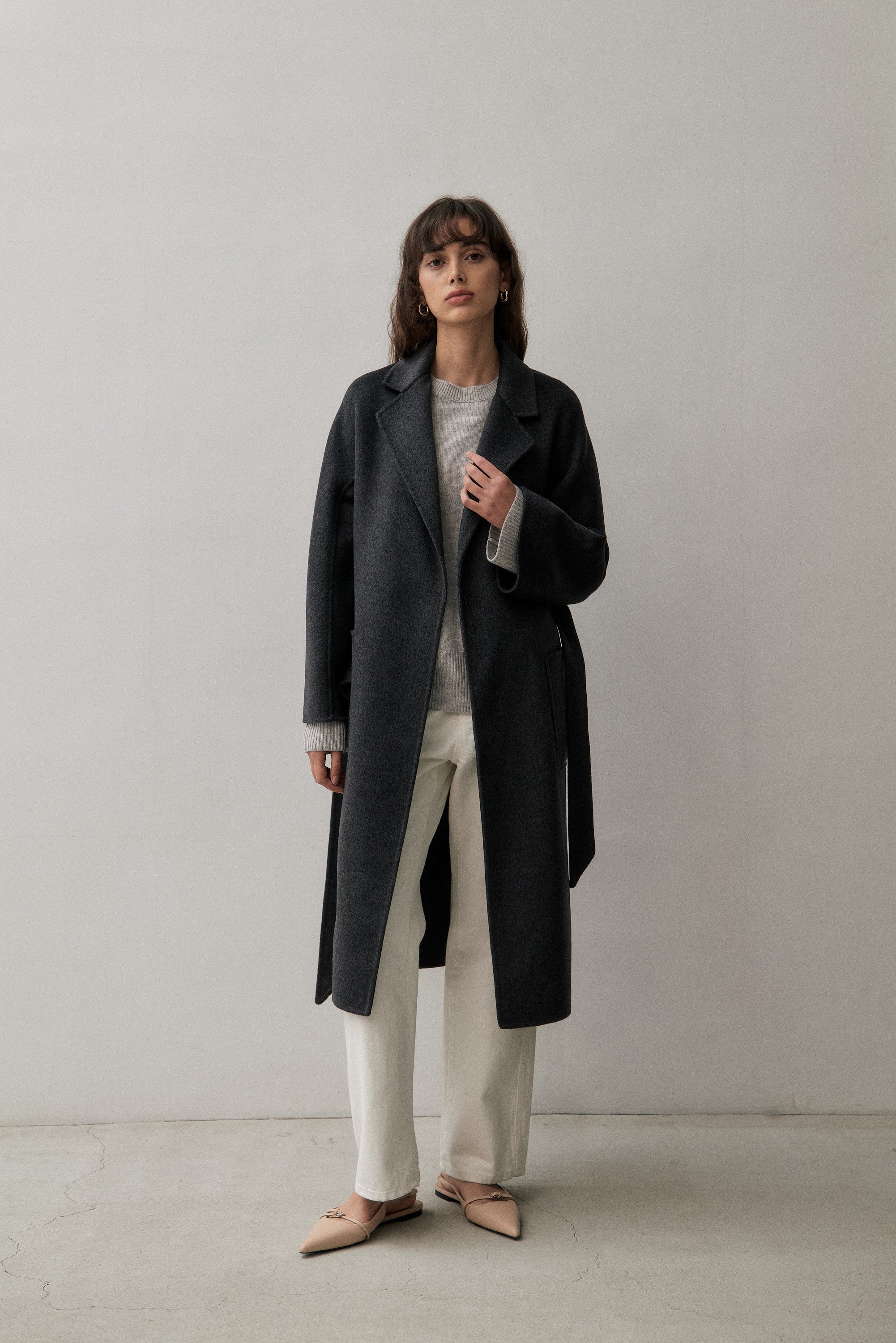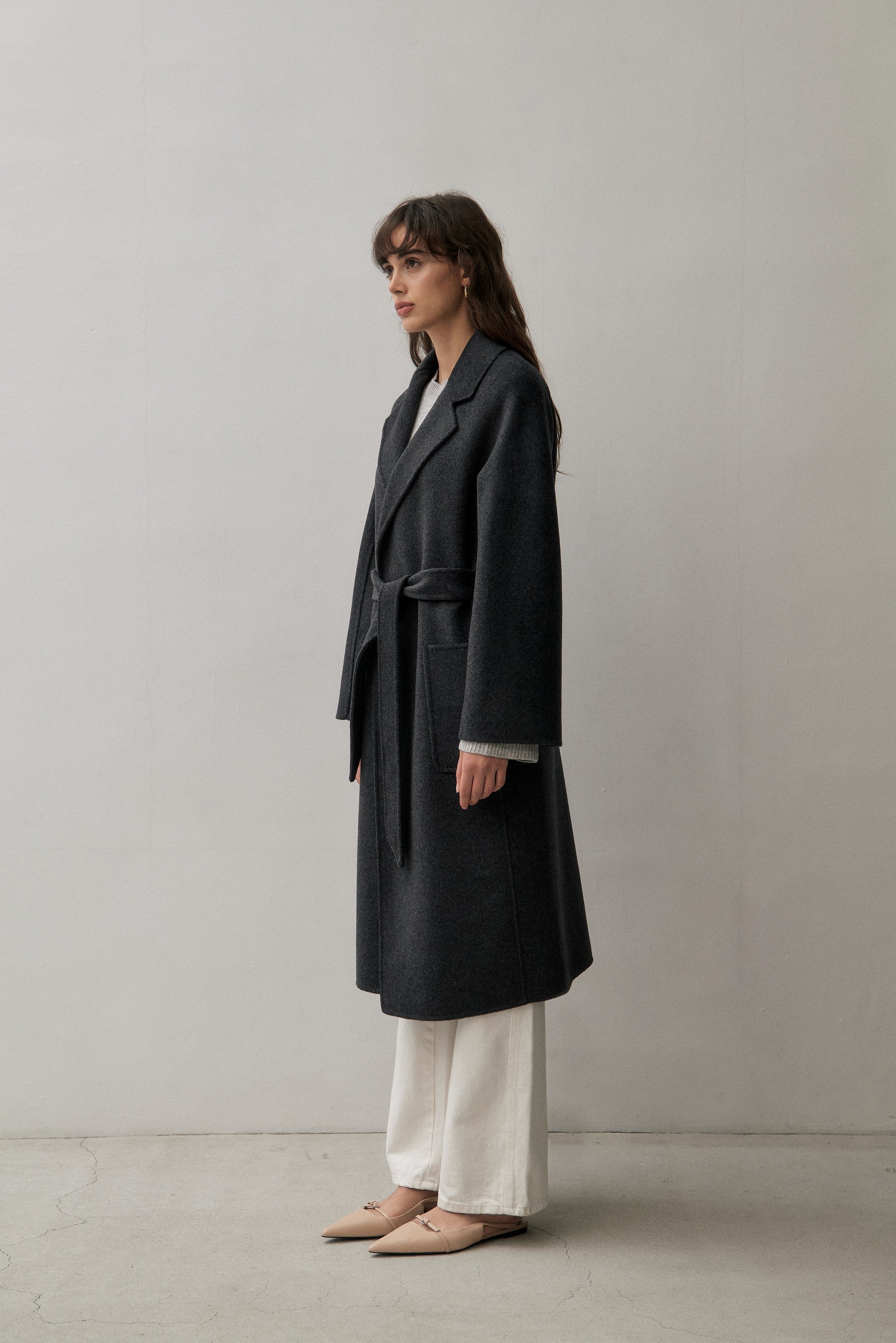 We've created the perfect coat for you. A classic timeless design made of cashmere blended with wool for warmth and durability. This coat can be worn tied up or open from day to night.