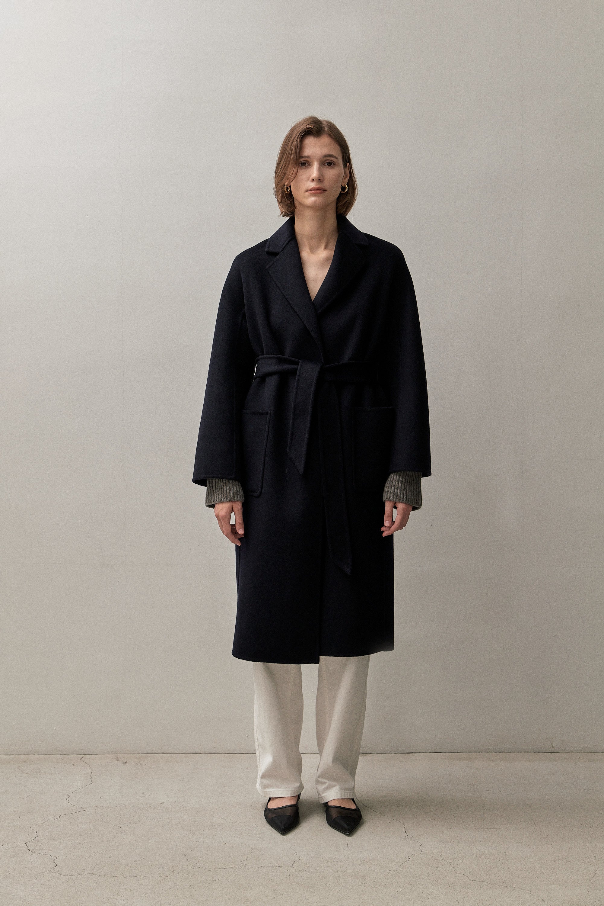 We've created the perfect coat for you. A classic timeless design made of cashmere blended with wool for warmth and durability. This coat can be worn tied up or open from day to night.